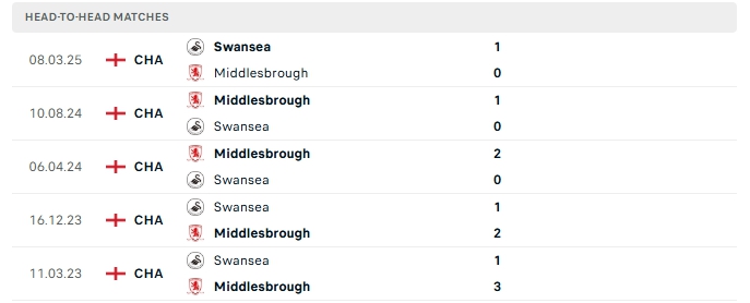 Lịch sử đối đầu của Middlesbrough vs Swansea City
