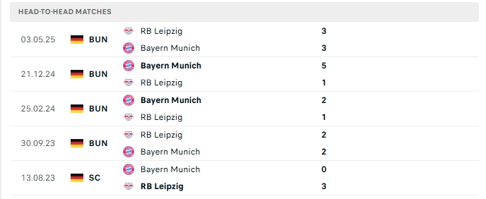 Những màn đụng độ giữa Bayern Munich và Leipzig thường diễn ra hấp dẫn với nhiều bàn thắng được tạo ra, cụ thể ở cả 5 lần gặp nhau gần nhất và cả 5 lần đón tiếp Leipzig trên sân nhà của Bayern Munich đều khép lại trên 3 bàn thắng.