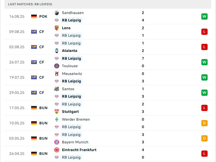 Bên kia sân, Leipzig cũng có cho mình 5 trận giao hữu với thành tích thắng 3, và thua 2, 2 thất bại liên tiếp trước Atalanta và Lens ở 2 trận gần nhất ít nhiều ảnh hưởng đến sự tự tin của đội bóng này, dù họ vừa có chiến thắng 4-2 trước đối thủ Sandhausen ở sân chơi Cúp, khi thi đấu xa nhà Leipzig chơi không quá tốt khi thua 4 hòa 2 và chỉ thắng 4 ở 10 trận vừa qua.