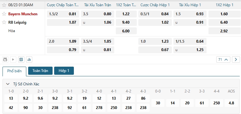 Bảng tỷ lệ kèo bóng đá trận đấu Bayern Munich vs Leipzig