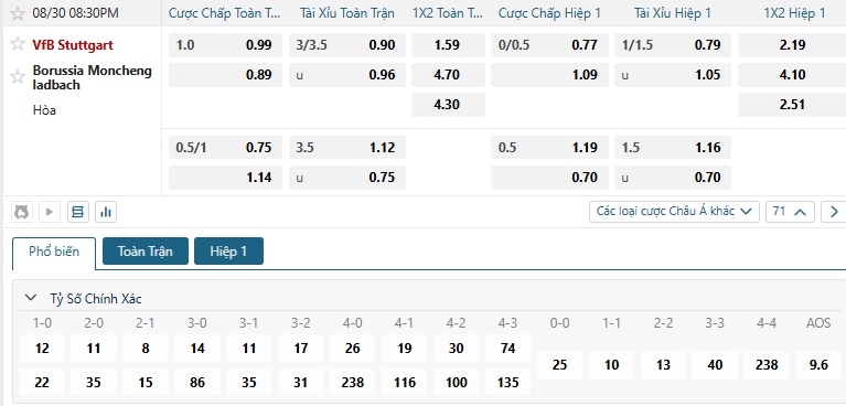 Bảng tỷ lệ kèo bóng đá trận đấu Stuttgart vs Monchengladbach
