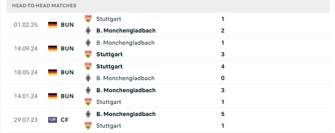 Những màn đụng độ giữa Stuttgart và Monchengladbach thường diễn ra hấp dẫn với nhiều bàn thắng được tạo ra, cụ thể ở 5 lần gặp nhau gần nhất và 5 lần đón tiếp Monchengladbach trên sân của Stuttgart khép lại trên 3 bàn.