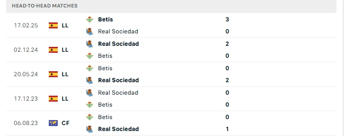 Những màn đụng độ giữa Real Betis và Real Sociedad không có nhiều bàn thắng được tạo ra, cụ thể ở 4/5 lần gặp nhau gần nhất và 3/5 lần đón tiếp Real Sociedad trên sân của Real Betis khép lại không quá 2 lần lưới rung.