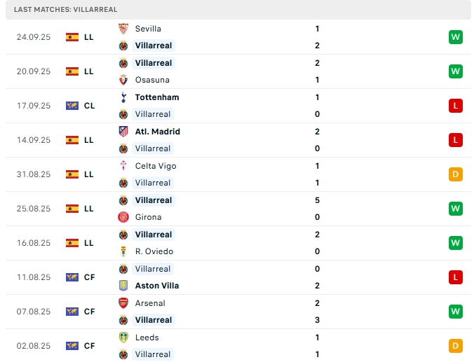 Phong độ gần đây Villarreal vs Athletic Bilbao