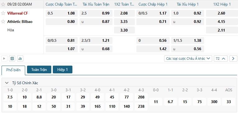 Bảng tỷ lệ kèo bóng đá trận đấu Villarreal vs Athletic Bilbao
