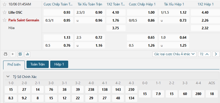 Nhà cái châu Á đang đánh giá cao khả năng chiến thắng của PSG là cao hơn so với Lille, khi đưa ra mức chấp đang là 0.75, Dù phải hành quân đến sân đối thủ nhưng sự vượt trội về phong độ, chất lượng đội hình cùng với đó là sự vượt trội của PSG trong những lần đối đầu thì họ hứa hẹn là những người kiểm soát thế trận và hướng đến chiến thắng, Lựa chọn PSG cho kèo châu Á.