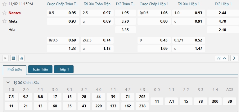 Bảng tỷ lệ kèo bóng đá trận đấu Nantes vs Metz