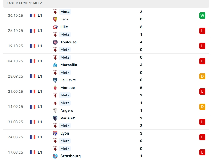 Metz sau 10 vòng đấu, hàng công đội bóng này mang về 8 bàn thắng, cùng hàng thủ nhận 26 bàn thua, việc hàng thủ đang chơi tệ khiến Metz đang lún sâu trên BXH, họ cần sớm khắc phục điểm yếu này nếu không muốn tiếp tục bị đối thủ khai thác.