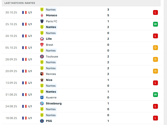 Nantes sau 10 lượt trận đầu tiên, hàng công của đội bóng này mang về 10 bàn thắng có được cùng hàng thủ nhận 15 bàn thua, hàng công thi đấu không quá tốt khiến Nantes đang gặp khó, trên sân nhà ở 3/5 trận gần nhất của Nantes khép lại không quá 2 bàn thắng.