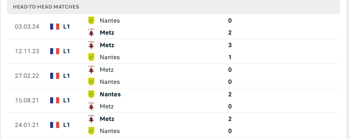 Lịch sử đối đầu của Nantes vs Metz