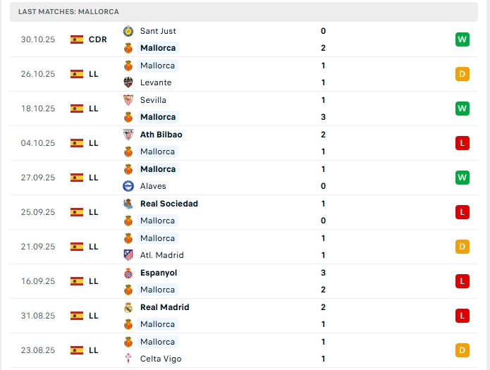 Mallorca ở 10 vòng đấu đầu tiên, hàng công chỉ mang về 11 bàn thắng cùng hàng thủ nhận 15 bàn thua, 3/5 trận vừa qua của Mallorca khép lại không quá 2 bàn, lối chơi của Mallorca thiên về phòng ngư nên những trận đấu có sự góp mặt của họ không nhiều bàn thắng.