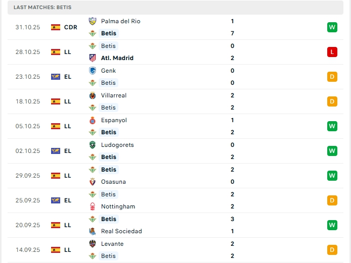 Real Betis sau 10 vòng đấu, hàng công của đội bóng này mang về 15 bàn thắng cùng hàng thủ nhận 12 bàn thua, 2/3 trận vừa qua của Real Betis đều khép lại không quá 2 bàn thắng, trên sân nhà của mình ở 2 trận gần nhất cũng khép lại không quá 2 bàn.