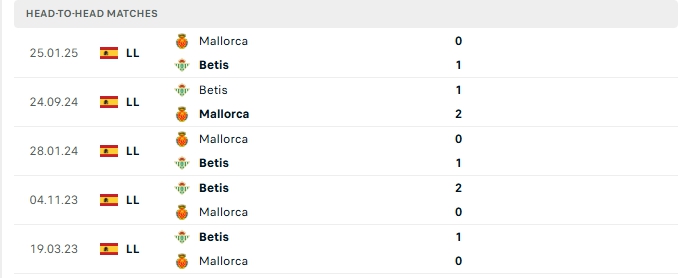 Những màn đụng độ giữa Real Betis và Mallorca không có nhiều bàn thắng được tạo ra, cụ thể ở 4/5 lần gặp nhau gần nhất và 2/3 lần đón tiếp Mallorca trên sân của Real Betis khép lại không quá 2 lần lưới rung.