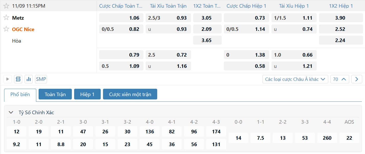 Bảng tỷ lệ kèo bóng đá trận đấu Metz vs OGC Nice