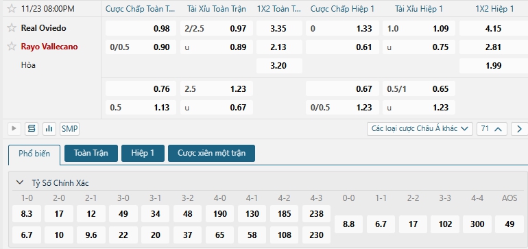 Bảng tỷ lệ kèo bóng đá trận đấu Real Oviedo vs Rayo Vallecano