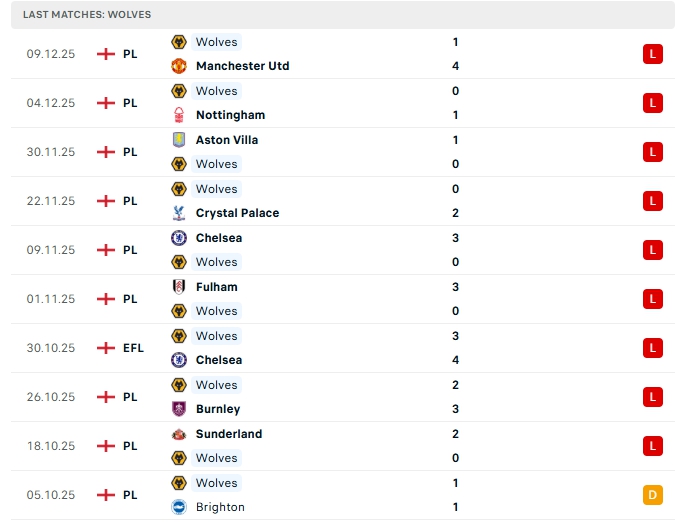 Bên kia sân, Wolves sau 15 trận đấu, đội bóng này có cho mình 2 hòa cùng 13 thất bại, có được 2 điểm và đang xếp cuối cùng trên BXH, ở vòng đấu gần nhất Wolves nhận thất bại 1-4 trước Man Utd, đây là trận thua thứ 9 liên tiếp của đội bóng này, phong độ thời gian qua của Wolves là cực kỳ tệ, khi xa nhà Wolves cũng thua 4 trận liên tiếp vừa qua và không có chiến thắng nào ở 11 trận gần nhất.
