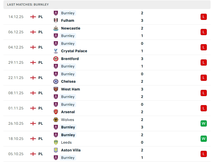 Burnley sau 16 trận đấu, hàng công của đội bóng này mang về 18 bàn thắng cùng hàng thủ chơi tệ khi nhận 33 bàn thua, hàng thủ đang là điểm yếu của Burnley khiến họ gặp nhiều khó khăn, 3/5 trận vừa qua của Burnley khép lại trên 3 bàn thắng, khi thi đấu xa nhà ở cả 5 trận vừa qua của Burnley đều vượt mốc 3 bàn thắng.