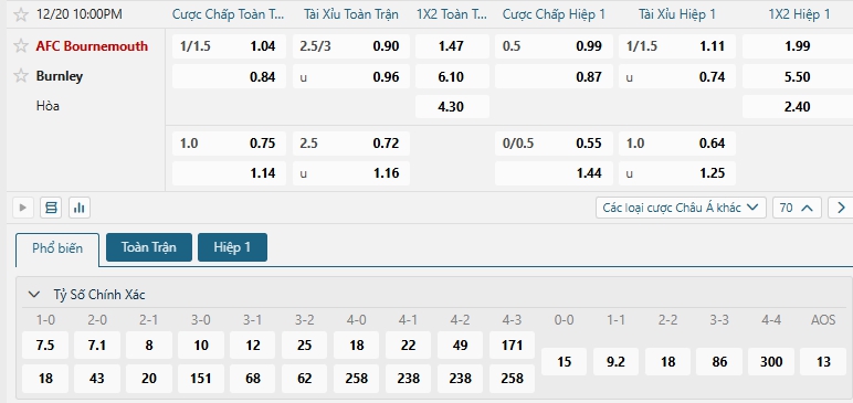 Nhà cái châu Á đang đánh giá cao khả năng chiến thắng của Bournemouth là cao hơn so với Burnley, khi đưa ra mức chấp đang là 1.25, Bournemouth có được ưu thế sân nhà nơi họ đang chơi cực kỳ tốt, trong khi Burnley lại chơi không tốt khi xa nhà và đang bị đánh giá thấp về thực lực, dù vậy để tạo chiến thắng cách biệt là không hề dễ dàng với Bournemouth, Bournemouth cũng thường gặp khó khi đón tiếp Burnley, lựa chọn Burnley ở kèo châu Á.