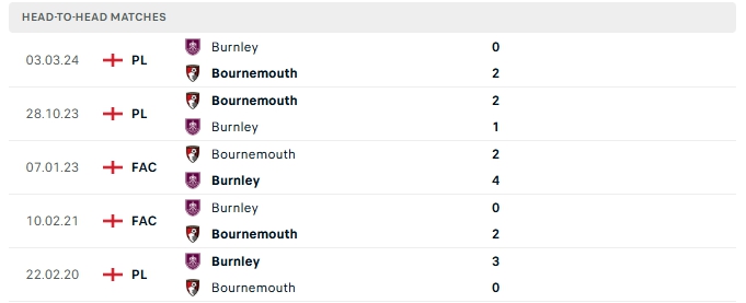 Lịch sử đối đầu của Bournemouth vs Burnley