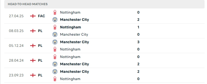 Những màn đụng độ giữa Nottingham Forest và Man City thường diễn ra chặt chẻ với ít bàn thắng được tạo ra, cụ thể ở 4/5 lần gặp nhau gần nhất và cả 5 lần đón tiếp Man City trên sân nhà của Nottingham Forest khép lại không quá 2 lần lưới rung.