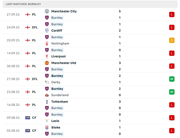 Burnley ở 6 lượt trận đầu tiên đội bóng này có 6 bàn thắng nào cùng hàng thủ chơi tệ khi nhận 13 bàn thua, 3/5 trận gần nhất của Burnley khép lại từ 3 bàn trở lên, khi thi đấu xa nhà ở 4/5 trận gần nhất của Burnley cũng có kết quả tương tự.