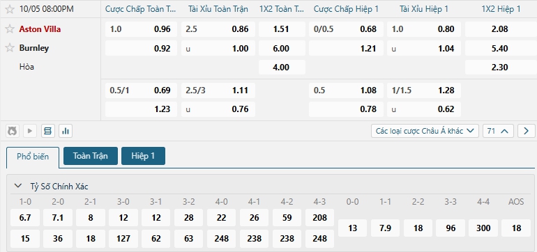 Nhà cái châu Á đang đánh giá cao khả năng chiến thắng của chủ nhà Aston Villa, khi đưa ra mức chấp đang là 1.0, có được ưu thế sân nhà sở hữu thực lực được đánh giá cao hơn, Aston Villa sẻ là đội kiểm soát thế trận và hướng đến chiến thắng cho mình, trên sân nhà của mình Aston Villa đang chơi tốt, trong khi các vị khách Burnley lại đang chơi tệ thời gian qua, họ sẻ gặp nhiều khó khăn trước đối thủ, lựa chọn Aston Villa cho kèo châu Á.