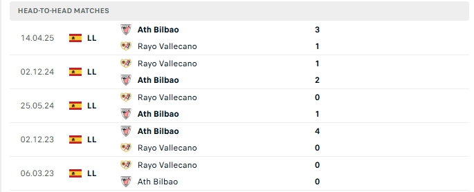 Lịch sử đối đầu của Athletic Bilbao vs Rayo Vallecano