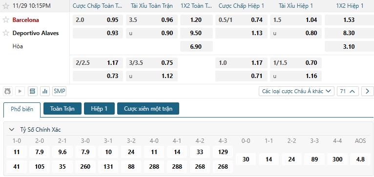 Bảng tỷ lệ kèo bóng đá trận đấu Barcelona vs Alaves