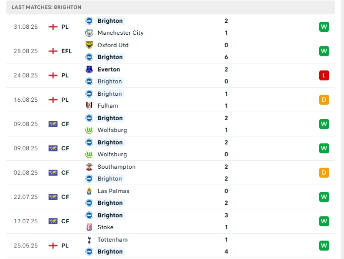 Bên kia sân, Brighton sau 3 trận đấu họ có được 4 điểm với 1 chiến thắng, 1 hòa cùng 1 thất bại, đang xếp vị trí thứ 11 trên BXH, ở ngày ra quân họ có trận hòa 1-1 trước Fullham, sau đó thất bại 0-2 trước Everton và mới nhất là chiến thắng 1-2 trước Man City, rỏ ràng sự ổn định là điều Brighton đang thiếu,dù vậy 3 điểm trước đội bóng mạnh là Man City cũng đem đến nhiều sự tự tin cho các vị khách, phong độ khi xa nhà của Brighton là ấn tượng khi họ thắng 3, hòa 1 và thua 1 ở 5 trận đã qua.