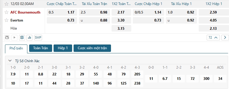 Bảng tỷ lệ kèo bóng đá trận đấu Bournemouth vs Everton