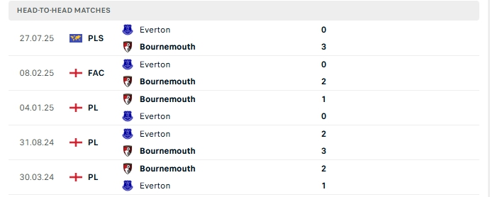 Những màn đụng độ giữa Bournemouth và Everton thường diễn ra hấp dẫn với nhiều bàn thắng được tạo ra, cụ thể ở 3/5 trận gần nhất và 3/5 lần đón tiếp Newcastle trên sân của Everton khép lại không quá 2 lần lưới rung.