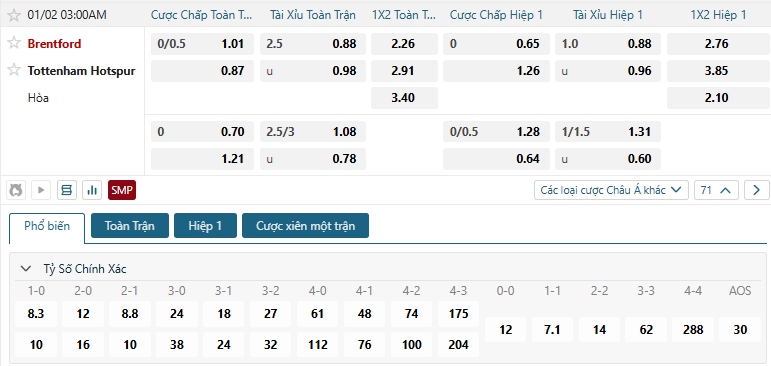 Bảng tỷ lệ kèo bóng đá trận đấu Brentford vs Tottenham