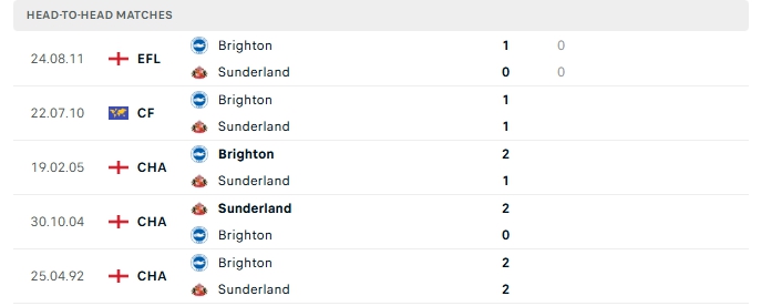 Những màn đụng độ giữa Brighton và Sunderland thường diễn ra chặt chẻ với ít bàn thắng được tạo ra, cụ thể ở 3/5 lần gặp nhau gần nhất và 2/3 lần đón tiếp Sunderland trên sân của Brighton khép lại không quá 2 bàn.