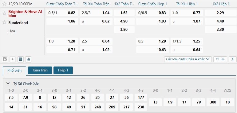 Bảng tỷ lệ kèo bóng đá trận đấu Brighton vs Sunderland
