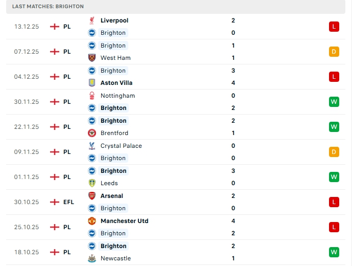 Brighton sau 16 lượt trận đầu tiên, hàng công của đội bóng này mang về 25 bàn thắng cùng hàng thủ nhận 23 bàn thua, 3/5 trận vừa qua của Brighton khép lại không quá 2 bàn thắng, dù vậy trên sân nhà ở 5 trận gần nhất thì có 4 trận chạm mốc từ 3 bàn trở lên.