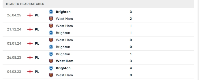 Lịch sử đối đầu của Brighton vs West Ham Utd