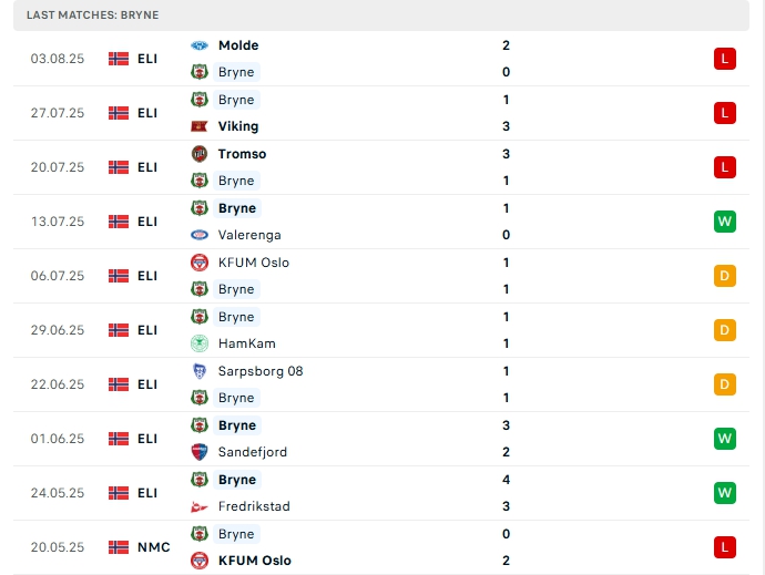 Bryne ở trận đấu gần nhất họ nhận thất bại 0-2 trước Molde, thất bại này là trận thua thứ 3 liên tiếp, sau 16 trận đã đấu thì họ có được 18 điểm và đang xếp thứ 13 trên BXH với 5 chiến thắng, 3 hòa cùng 8 thất bại, dù vậy phong độ trên sân nhà của Bryne thời gian qua là khá tốt, họ thắng 3, hòa 1 và chỉ thua 1 sau 5 trận đấu.