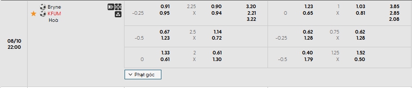 Nhà cái Châu Á đang đánh giá khả năng chiến thắng của KFUM Oslo là cao hơn so với các cầu thủ chủ nhà với tỷ lệ chấp là 0.25, dù phải hành quân đến sân đối thủ nhưng KFUM Oslo đang cho thấy sự ổn định về mặt phong độ thời gian qua, ngược lại Bryne lại cho thấy sự bất ổn, ở trận đấu này niềm tin nên đặt vào KFUM Oslo sẻ an toàn hơn.