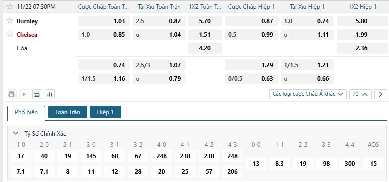 Nhà cái châu Á đang đánh giá cao khả năng chiến thắng của các vị khách Chelsea là cao hơn , khi đưa ra mức chấp đang là 1.0, Burnley dù sở hữu ưu thế sân nhà, nhưng họ không được đánh giá cao, The Clarets đang gặp khó về mặt phong độ sẻ đối diện với khó khăn khi đón tiếp Chelsea, đội bóng đang đặt nhiều quyết tâm ở mùa giải năm nay, họ cũng sở hữu dàn cầu thủ chất lượng cùng phong độ cao hơn, hơn nữa Chelsea thường có kết quả tốt khi đối đầu với Burnley, lựa chọn Chelsea cho kèo Châu Á.