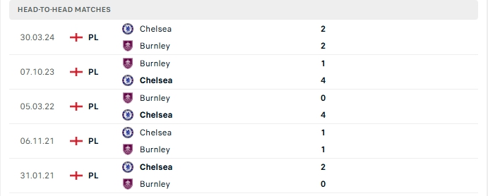 Những màn đụng độ giữa Burnley và Chelsea thường diễn ra hấp dẫn với nhiều bàn thắng được tạo ra, 3/5 lần gặp nhau gần nhất của hai đội và cả 5 lần đón tiếp Chelsea trên sân của Burnley khép lại trên 3 bàn.