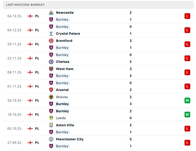 Burnley sau 15 vòng đấu, đội bóng này mang về 3 chiến thắng, 1 hòa cùng 11 thất bại, có được 10 điểm và đang xếp vị trí thứ 19 trên BXH, một vị trí trong nhóm cầm đèn đỏ, ở vòng đấu gần nhất Burnley nhận thất bại 1-2 trước Newcastle, trận thua này là trận thua thứ 6 liên tiếp của đội bóng này,  phong độ thời gian qua của Burnley là không tốt, trên sân nhà Burnley cũng chơi tệ khi chỉ thắng 1, thua 4 ở 5 trận gần nhất.