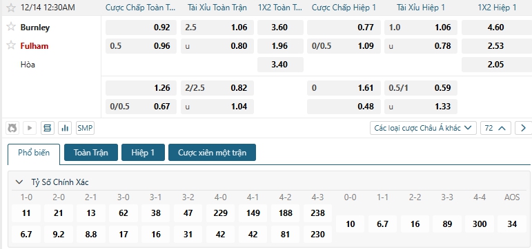 Bảng tỷ lệ kèo bóng đá trận đấu Burnley vs Fulham