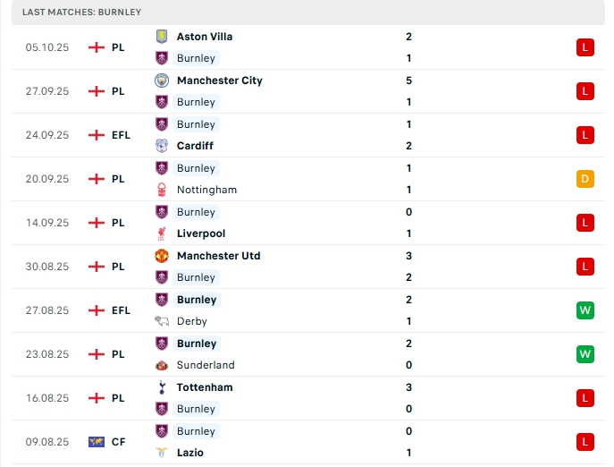 Burnley ở 7 vòng đấu đầu tiên, họ mang về 1 chiến thắng,1 hòa  và 5 thất bại, họ có được 4 điểm và đang xếp vị trí 18 trên BXH, ở trận gần nhất Burnley nhận thất bại 1-2 trước Aston Villa, đây là trận thua thứ 3 liên tiếp và là trận không thắng thứ 6, trong đó có 5  thất bại, phong độ thời gian qua của Burnley là không tốt, trên sân nhà Burnley cũng thua 2 trên 3 trận gần nhất.