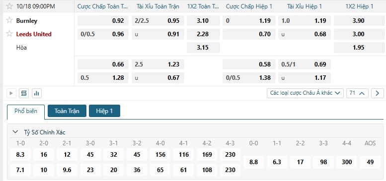 Nhà cái châu Âu đang đánh giá cao khả năng chiến thắng của Leeds Utd là cao hơn so với đối thủ khi đưa ra mức tỷ lệ là 2.28 và các cầu thủ chủ nhà là 3.10, chênh lệch là đủ lớn để đặt niềm tin vào Leeds Utd, họ sở hữu phong độ cùng lịch sử đối đầu ủng hộ khi thắng 2, hòa 2 và chỉ thua 1 trong 5 lần hành quân đến sân đối thủ, lựa chọn Leeds cho kèo châu Âu.