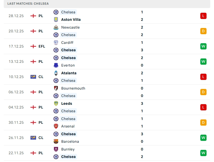 Chelsea sau 18 trận đấu họ mang về 8 chiến thắng, 5 hòa cùng 5 thất bại, có được 29 điểm và đang xếp vị trí thứ 5 trên BXH, ở vòng đấu gần nhất The Blues nhận thất bại 1-2 trước Aston Villa, trận thua này chấm dứt chuỗi 3 trận bất bại trước đó, phong độ thời gian qua của Chelsea là khá tốt, trên sân nhà Chelsea cũng mang về 3 chiến thắng, 1 hòa và 1 thất bại sau 5 trận đấu.