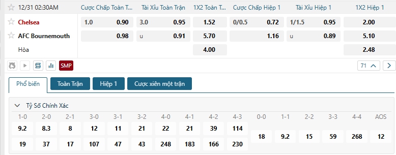 Nhà cái châu Á đang đánh giá cao khả năng chiến thắng của chủ nhà Chelsea, khi đưa ra mức chấp đang là 1.0, được thi đấu trên sân nhà và sở hữu phong độ cùng thực lực cao, The Blues được đánh giá cao hơn và sẻ hướng đến chiến thắng cho mình, trong khi việc chơi tệ sẻ khiến Bournemouth đối diện nguy cơ nhận thêm một thất bại, thậm chí một thất bại đậm trước chủ nhà, lựa chọn Chelsea cho kèo châu Á.