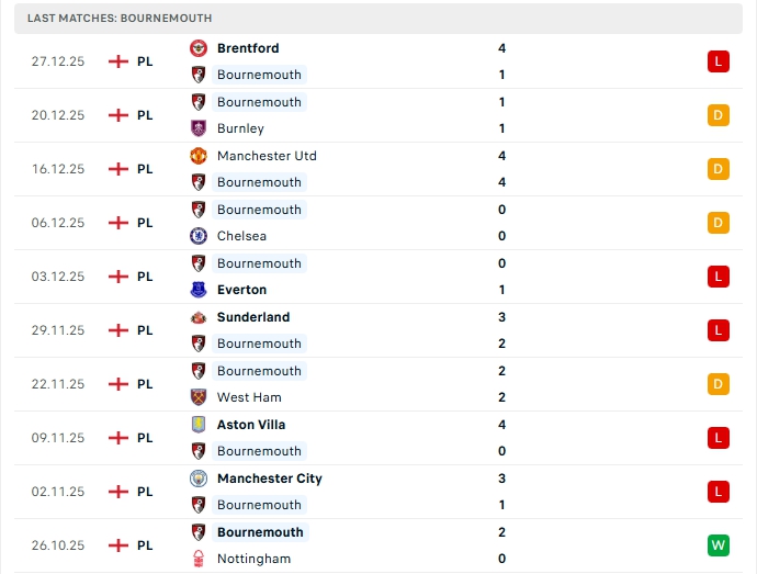 Bournemouth ở 18 lượt trận đội bóng này có được 27 bàn thắng cùng hàng thủ chơi tệ khi nhận đến 33 bàn thua, 2/3 trận gần nhất Bournemouth khép lại trên 3 bàn thắng, khi thi đấu xa nhà ở cả 5 trận vừa qua của họ khép lại trên 3 bàn, hàng thủ đang là điểm yếu của Bournemouth.