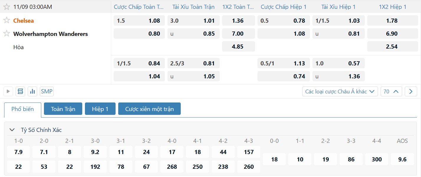 Bảng tỷ lệ kèo bóng đá trận đấu Chelsea vs Wolves