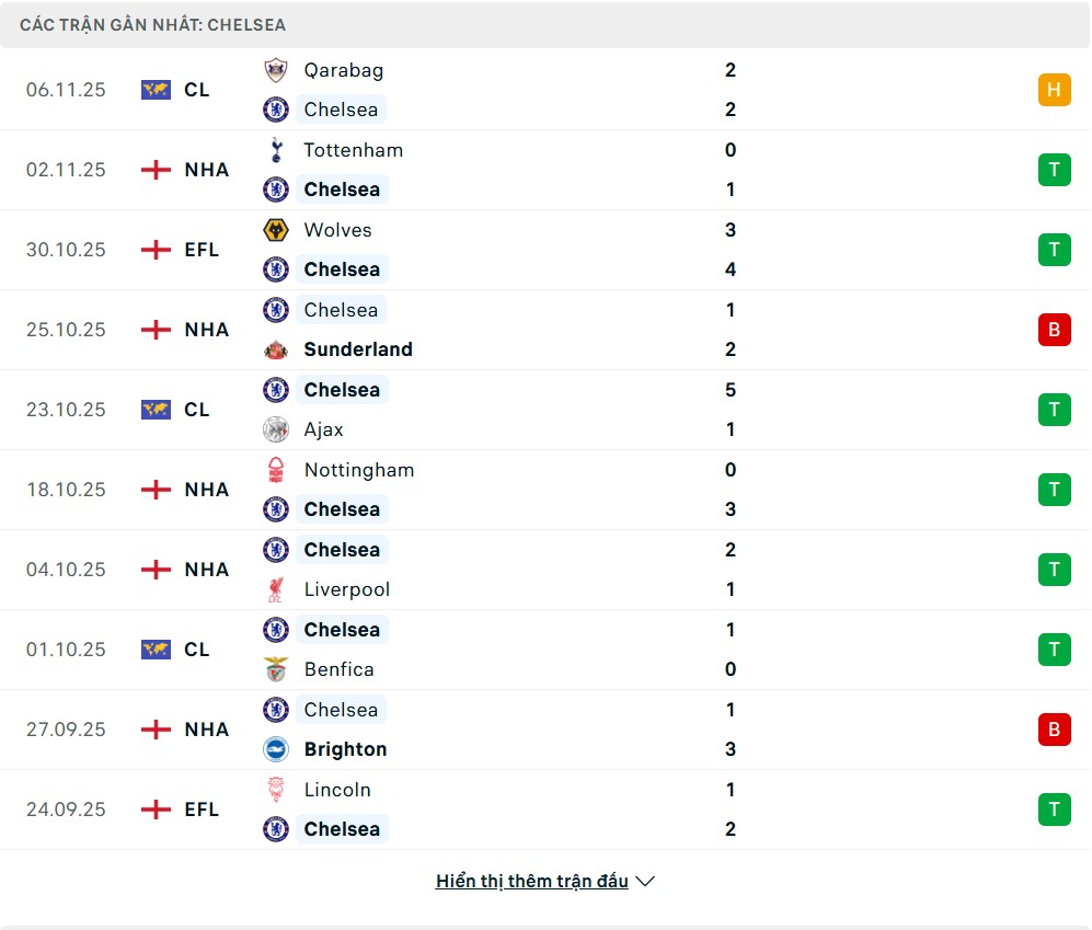 Chelsea đang cho thấy sự hồi sinh mạnh mẽ. Sau 10 vòng đấu, “The Blues” mang về 5 chiến thắng, 2 trận hòa và 3 thất bại. Hàng công của họ ghi 18 bàn, trong khi hàng thủ nhận 11 bàn thua – một con số phản ánh rõ phong cách tấn công cởi mở nhưng vẫn tiềm ẩn rủi ro. 4/5 trận gần nhất của Chelsea đều khép lại với ít nhất 3 bàn thắng, chứng minh khả năng bùng nổ của đội bóng này.