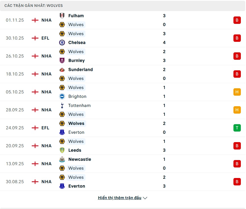 Trái ngược hoàn toàn, Wolves đang chìm sâu trong khủng hoảng. 10 trận trôi qua, “Bầy sói” chưa biết mùi chiến thắng, chỉ hòa 2 và thua tới 8, ghi 7 bàn nhưng thủng lưới tới 22 lần. Hàng phòng ngự của họ rối loạn và thiếu tổ chức, trong khi hàng công lại không đủ sức gây áp lực. 4/5 trận gần nhất của Wolves đều nổ tài, vì đơn giản – họ luôn để đối thủ “xé lưới” dễ dàng.